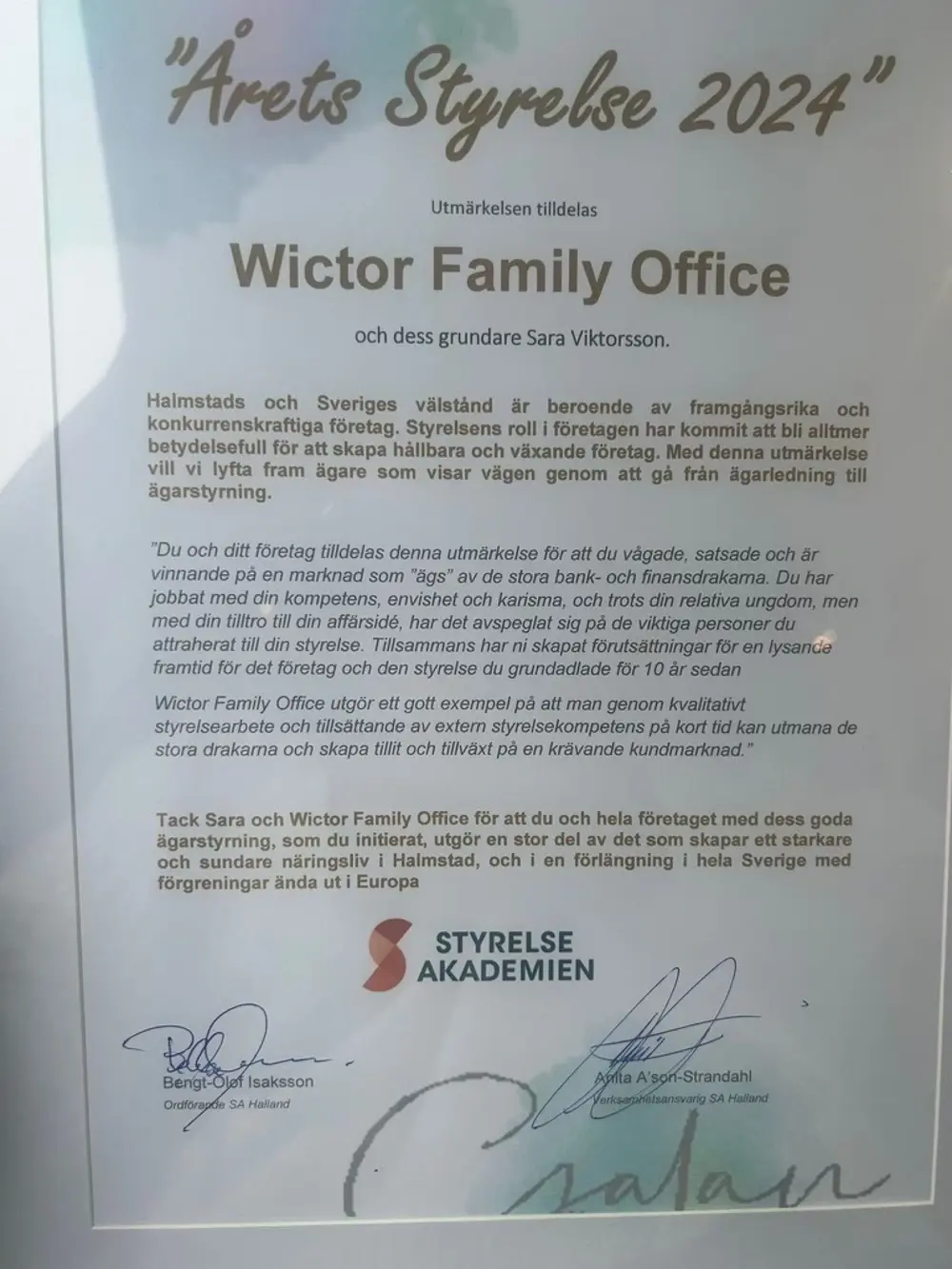 Tack Sara och Wictor Family Office för att du och hela företaget med dess goda ägarstyrning, som du initierat, utgör en stor del av det som skapar ett starkare och sundare näringsliv i Halmstad, och i en förlängning i hela Sverige med förgreningar ända ut i Europa.