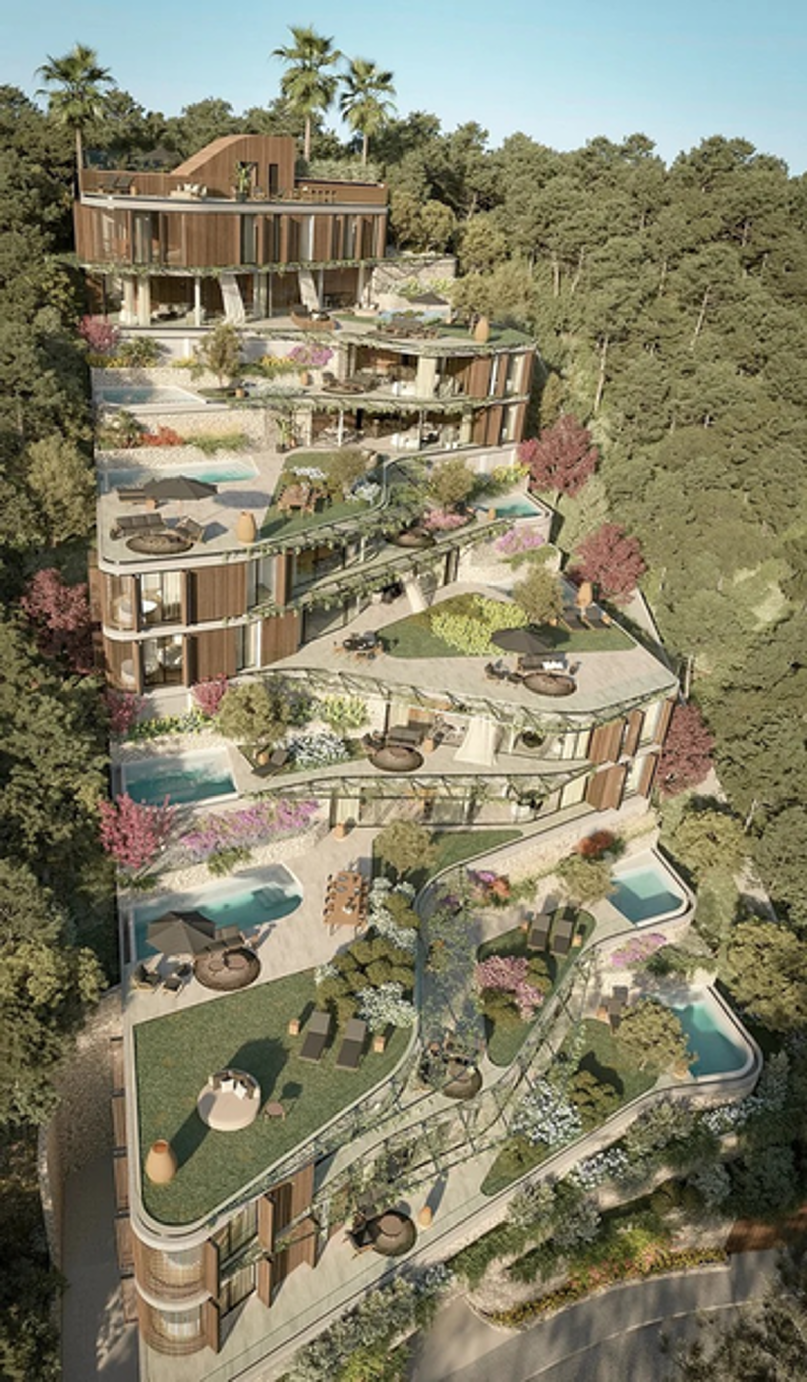 Varje lägenhet har sin egen privata nivå med trädgård, pool, parkering, gym, spa, vinkällare och biorum. Fastigheten har en otrolig panoramautsikt som sträcker sig från bergskedjan Tramuntana, vidare hela vägen till hamnen och havet genom den pittoreska Andratxdalen.